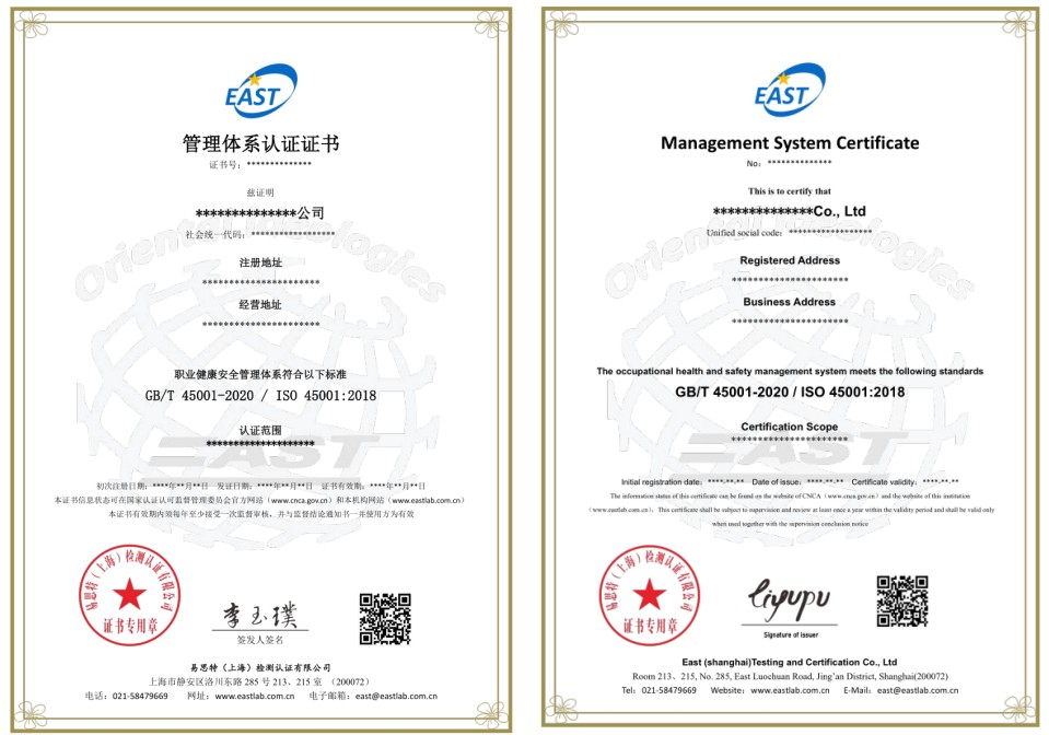 职业健康安全管理体系认证证书样式