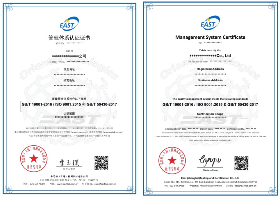 建筑施工质量管理体系认证证书样式