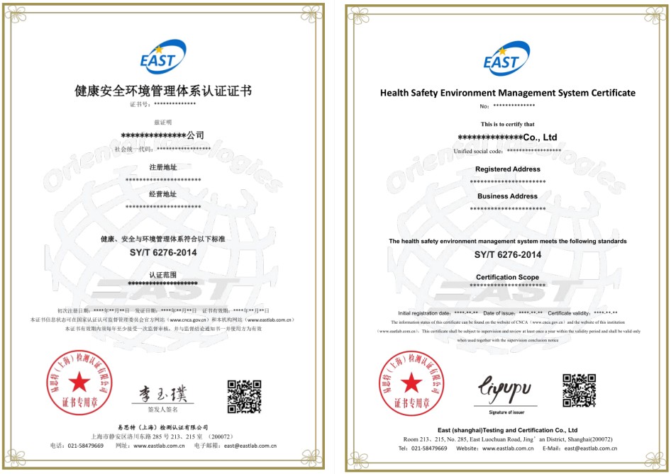 健康安全环境管理体系认证证书样式